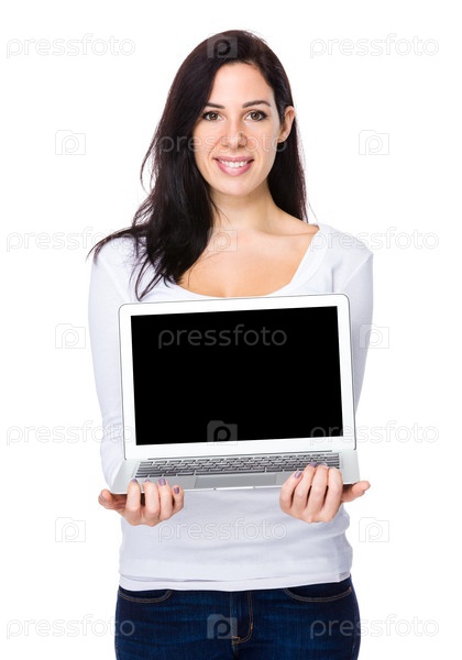 Брюнетка показывает пустой экран портативного компьютера