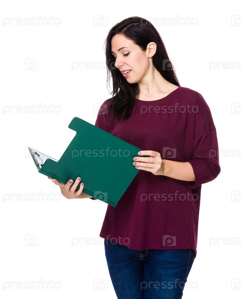 Брюнетка читает в планшетке