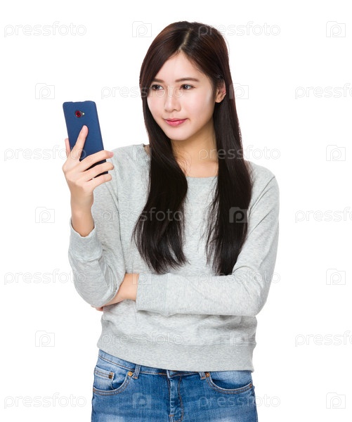 Женщина смотрит на сотовый телефон