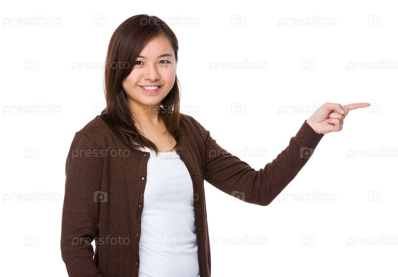 Азиатская женщина показывает пальцем