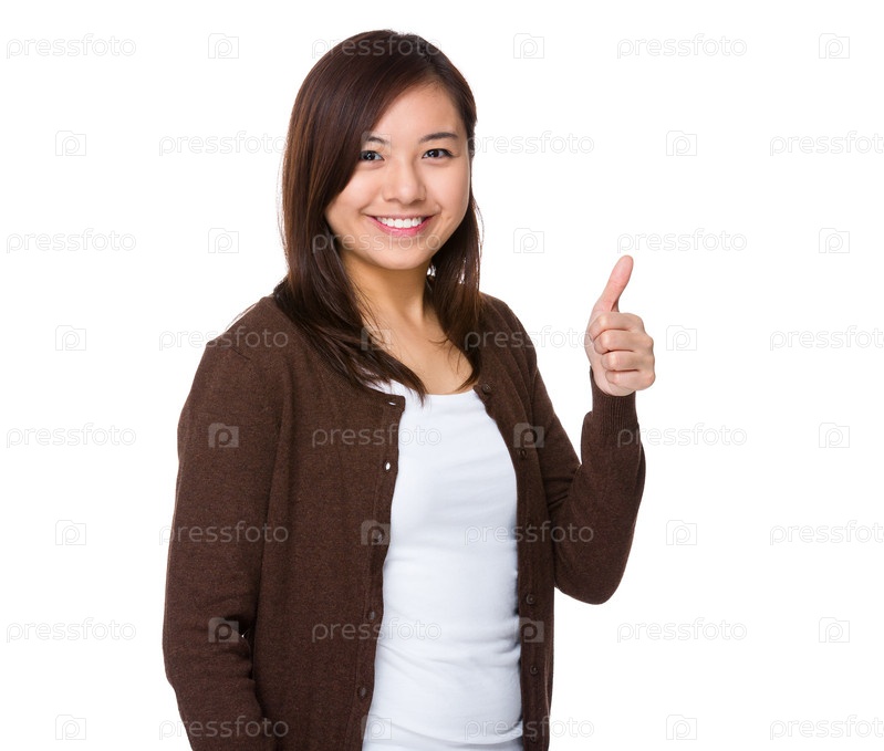 Молодая женщина показывает пальцем вверх