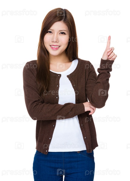 Молодая женщина указывает пальцем вверх