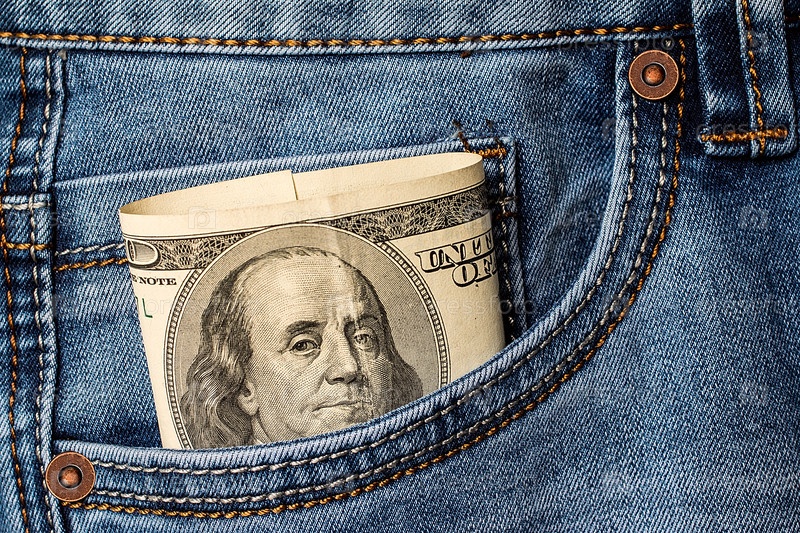 Долларовые банкноты в джинсовом кармане
