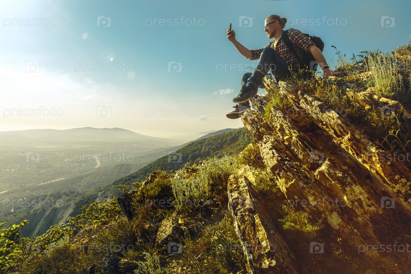 Турист с рюкзаком сидя на вершине горы фотографирует пейзаж