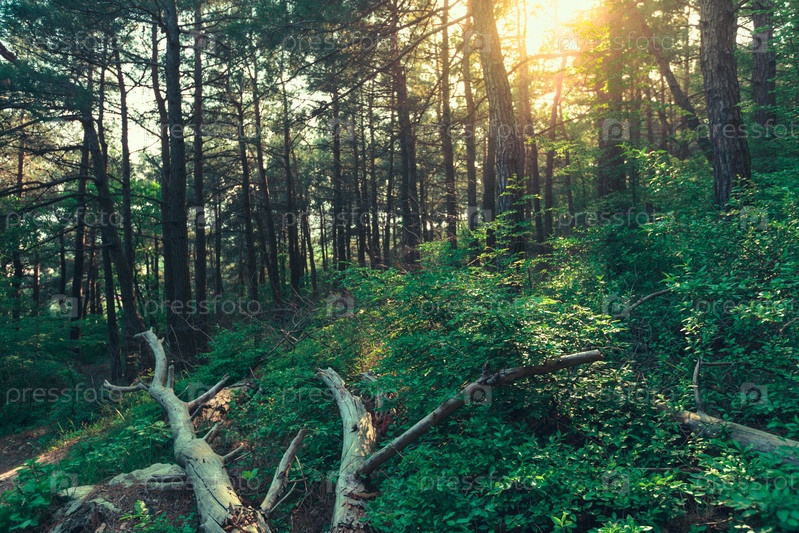 Весеннее солнце пробивается сквозь ветви деревьев в чаще, Северный Кавказ