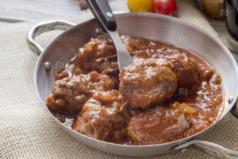 Фрикадельки в томатном соусе на деревянном столе