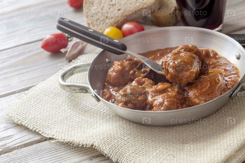 Фрикадельки в томатном соусе на деревянном столе