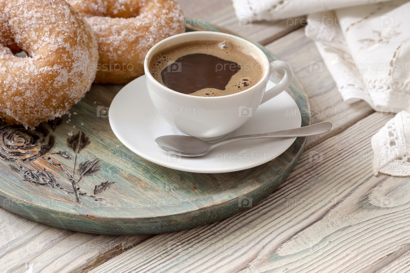 Заваренный кофе в чашке с пончиками