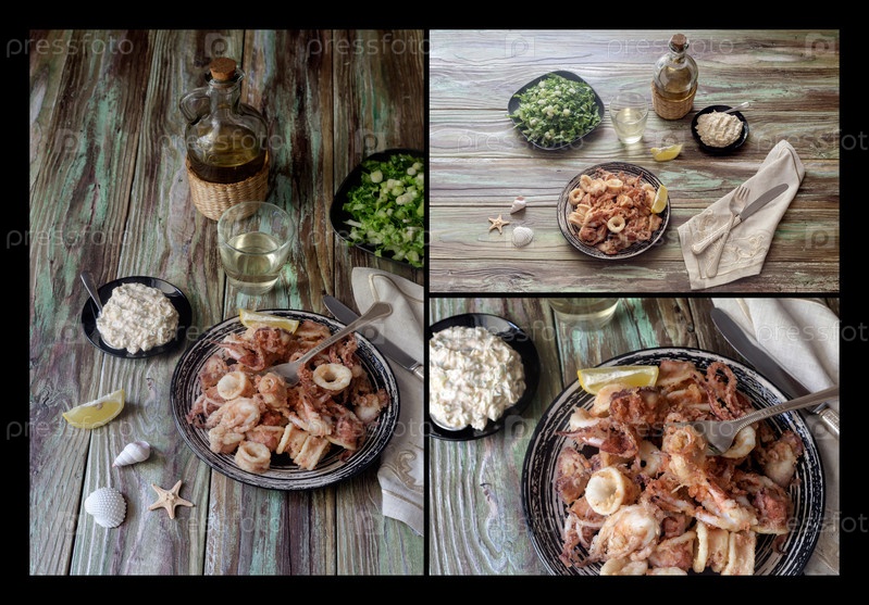 Жареные кальмары, салат, соус и белое вино