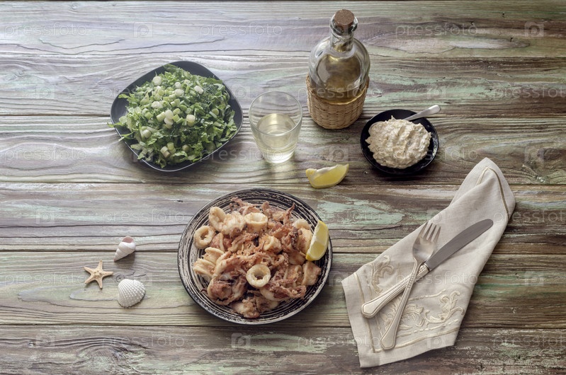 Жареные кальмары, салат, соус и белое вино