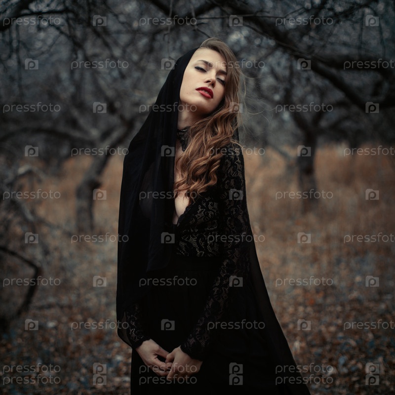 Красивая готичная девушка в черном старинном платье в лесу
