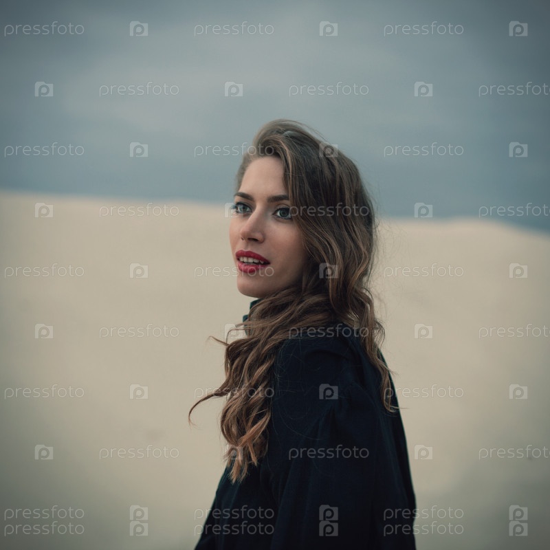 Красивая девушка в черном старинном платье на песке