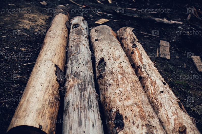 Куча вырубленных сосновых бревен в лесу