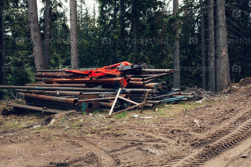 Ржавые металлические трубы в сосновом лесу