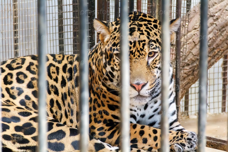 Грустный леопард в клетке зоопарка