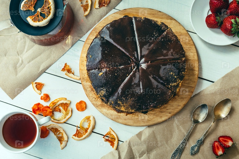 Вкусный шоколадный торт на деревянной поверхности