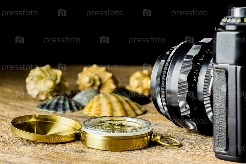 Старая фотокамера с морскими раковинами и компасом