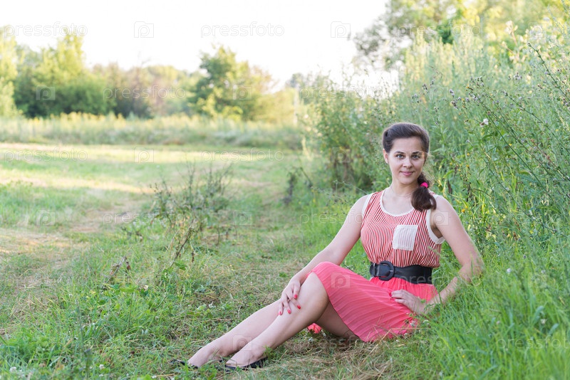 Девушка в красном платье на траве