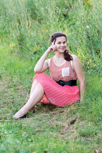 Девушка в красном платье на траве