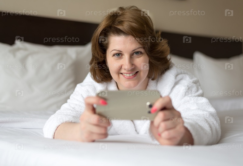 Женщина в халате с телефоном в гостиничном номере