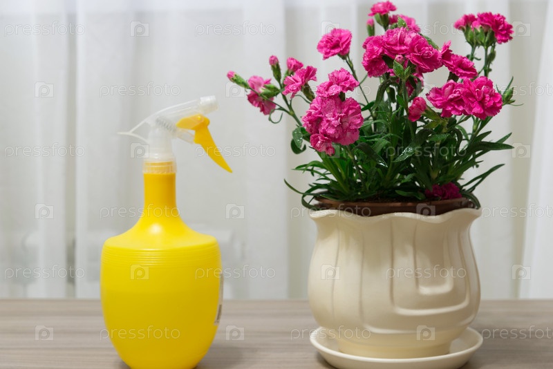 Красная гвоздика в горшке и распылитель