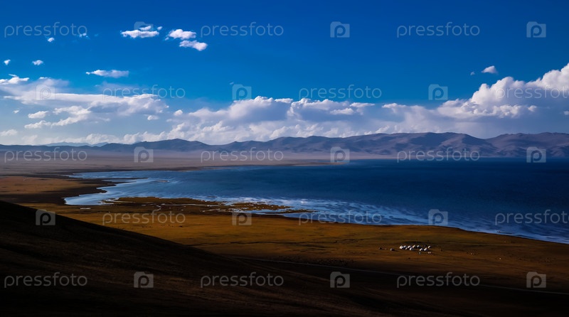 Панорама озера Сон-Куль на закате, Кыргызстан