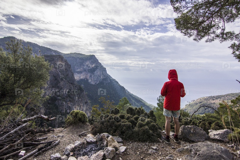 Человек на скале в горах над морем
