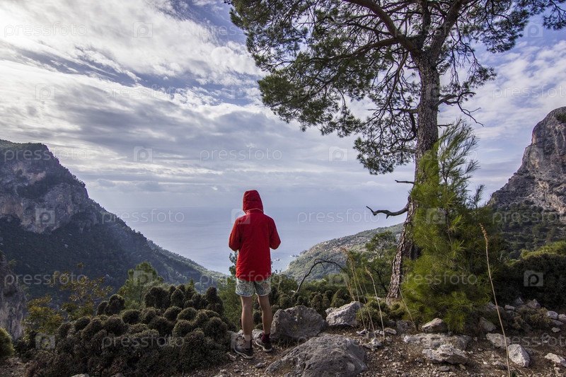 Человек на скале в горах над морем