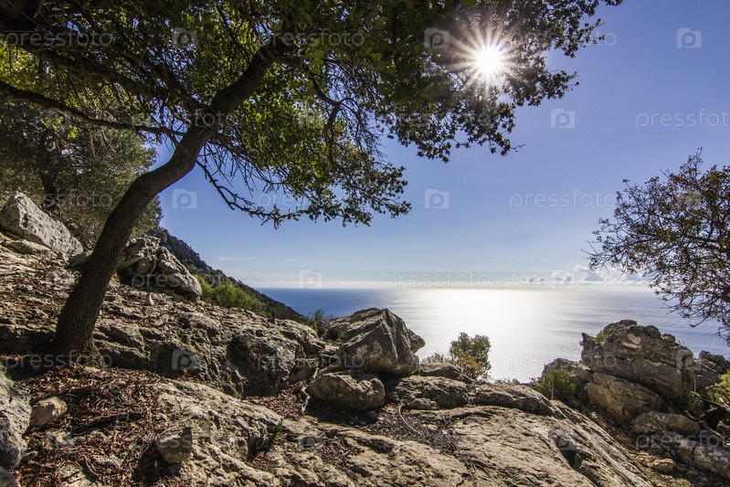 Солнце сквозь листья зеленого дерева в горах с голубым морем