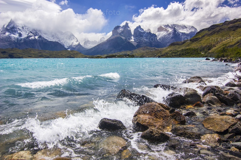 Горы Патагонии в дымке при дневном свете с голубым озером