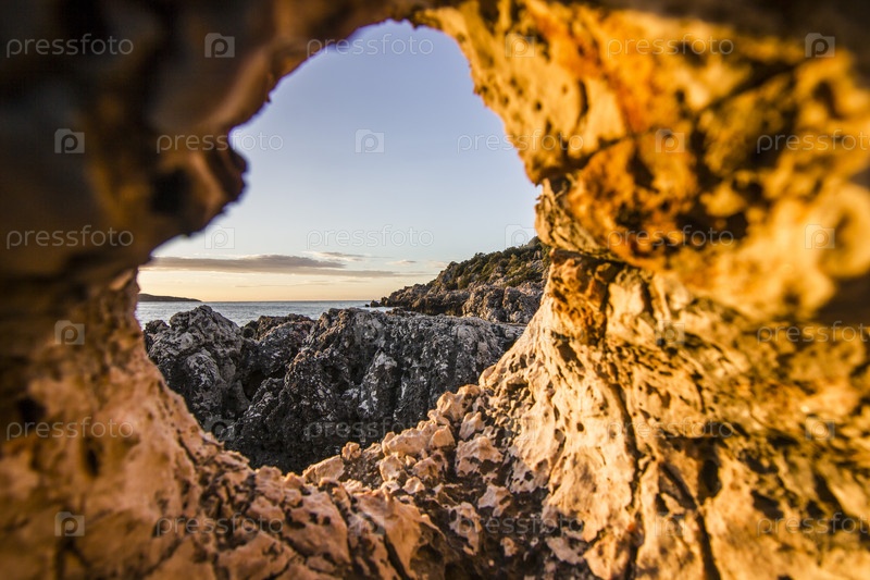 Вид из дыры в камне на вулканический пляж