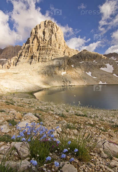 Озеро в горах с большой скалой в Турции, Аладаглар