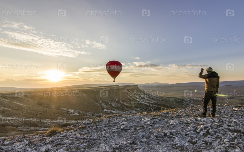 Воздушные шары на рассвете возле большой белой скалы