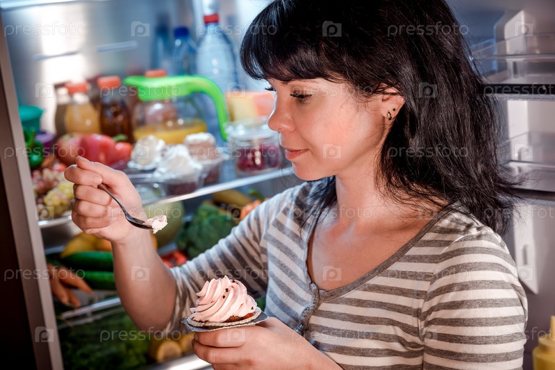 Женщина ест нездоровую пищу из холодильника ночью