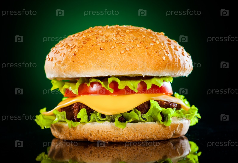 Вкусный и аппетитный гамбургер на темно-зеленом