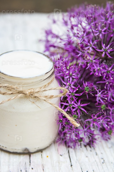 Йогурт и фиолетовые цветы