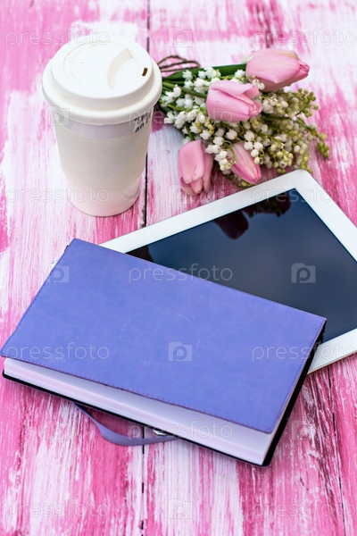 Дневник, планшетный компьютер, стакан кофе и цветы