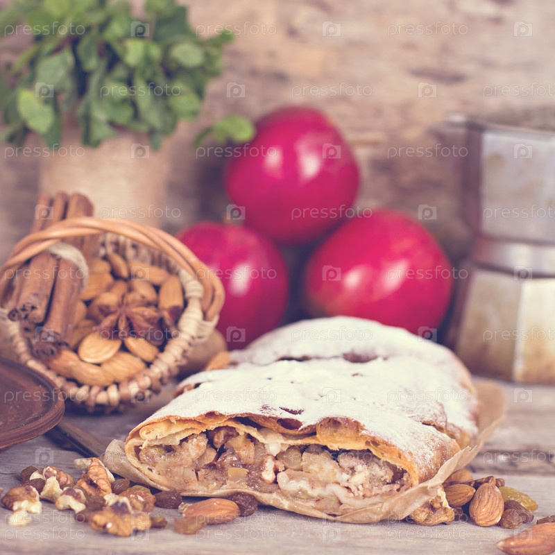 Нарезанный самодельный яблочный штрудель со свежими яблоками