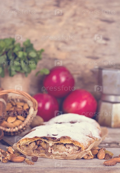 Нарезанный самодельный яблочный штрудель со свежими яблоками