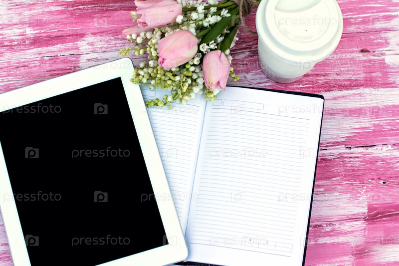 Дневник, планшетный компьютер, стакан кофе и цветы