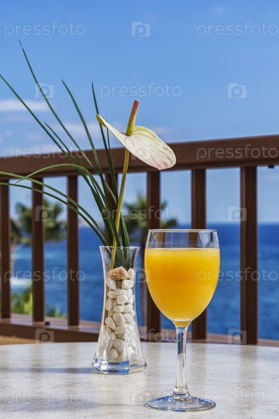 Стакан апельсинового сока и ваза с цветком на фоне моря