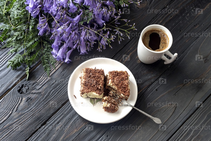 Кофе с пирожными и букетом колокольчиков
