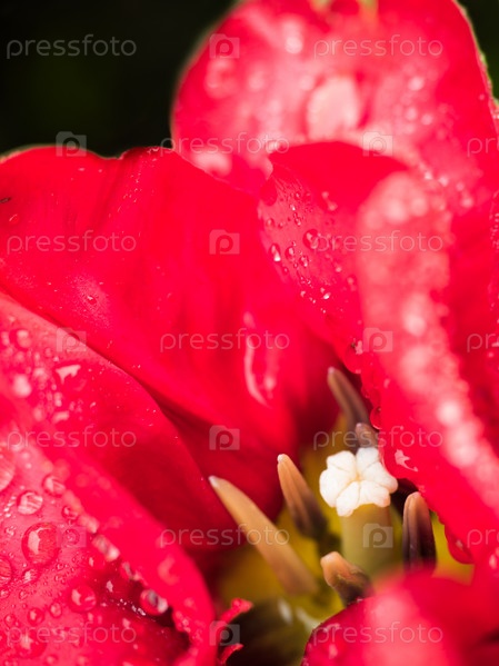 Лепестки красного цветка с каплями воды