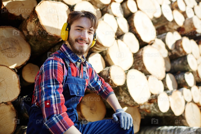 Улыбающийся лесоруб с кучей дров