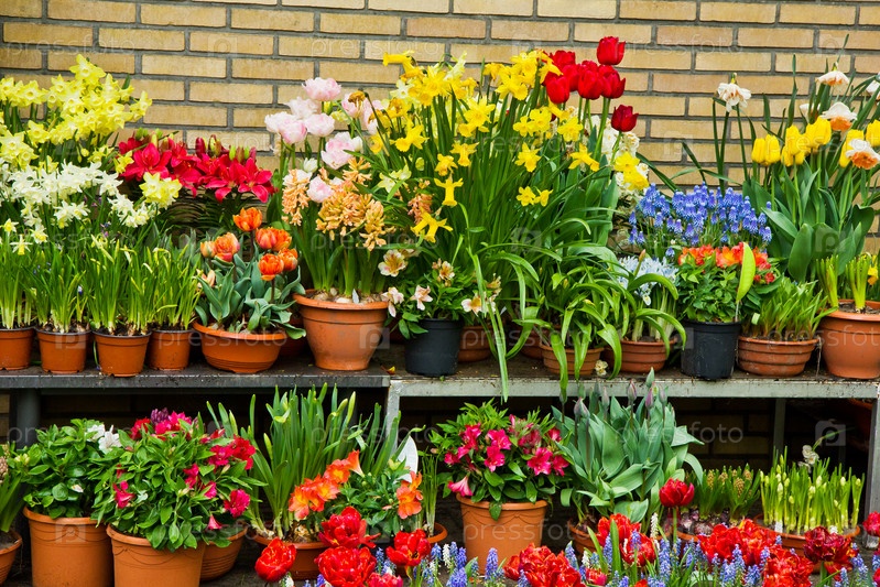 Горшки с цветами на полке у кирпичной стены