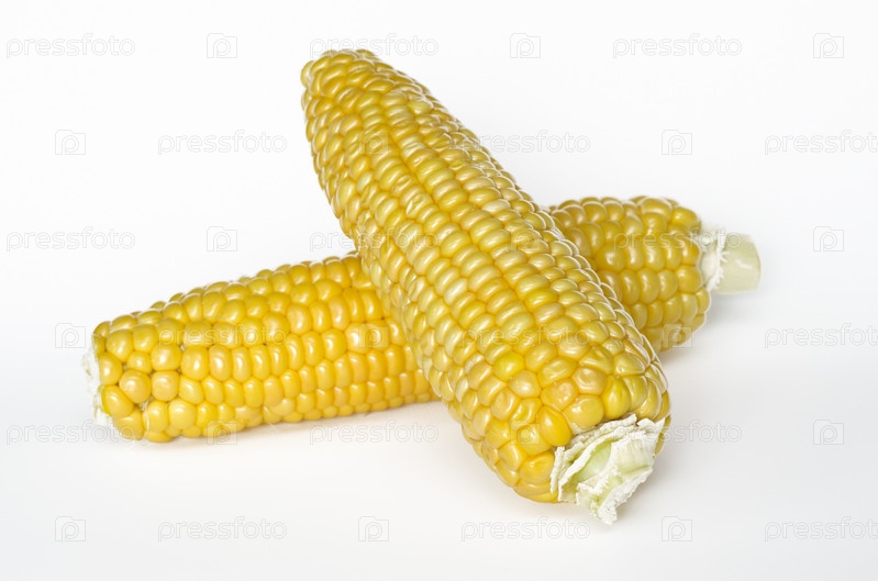 Два очищенных початка кукурузы на белом фоне