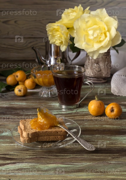 Мушмулама с желтыми розами, вареньем с сухариками и чаем