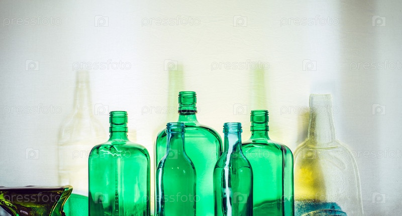 Пустые цветные стеклянные бутылки стоящие в ряд