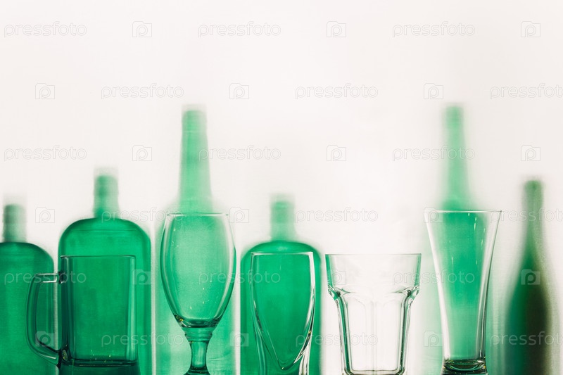 Пустые зеленые стеклянные бутылки и пивные бокалы