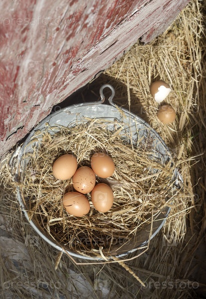 Свежие яйца в ведро с соломой